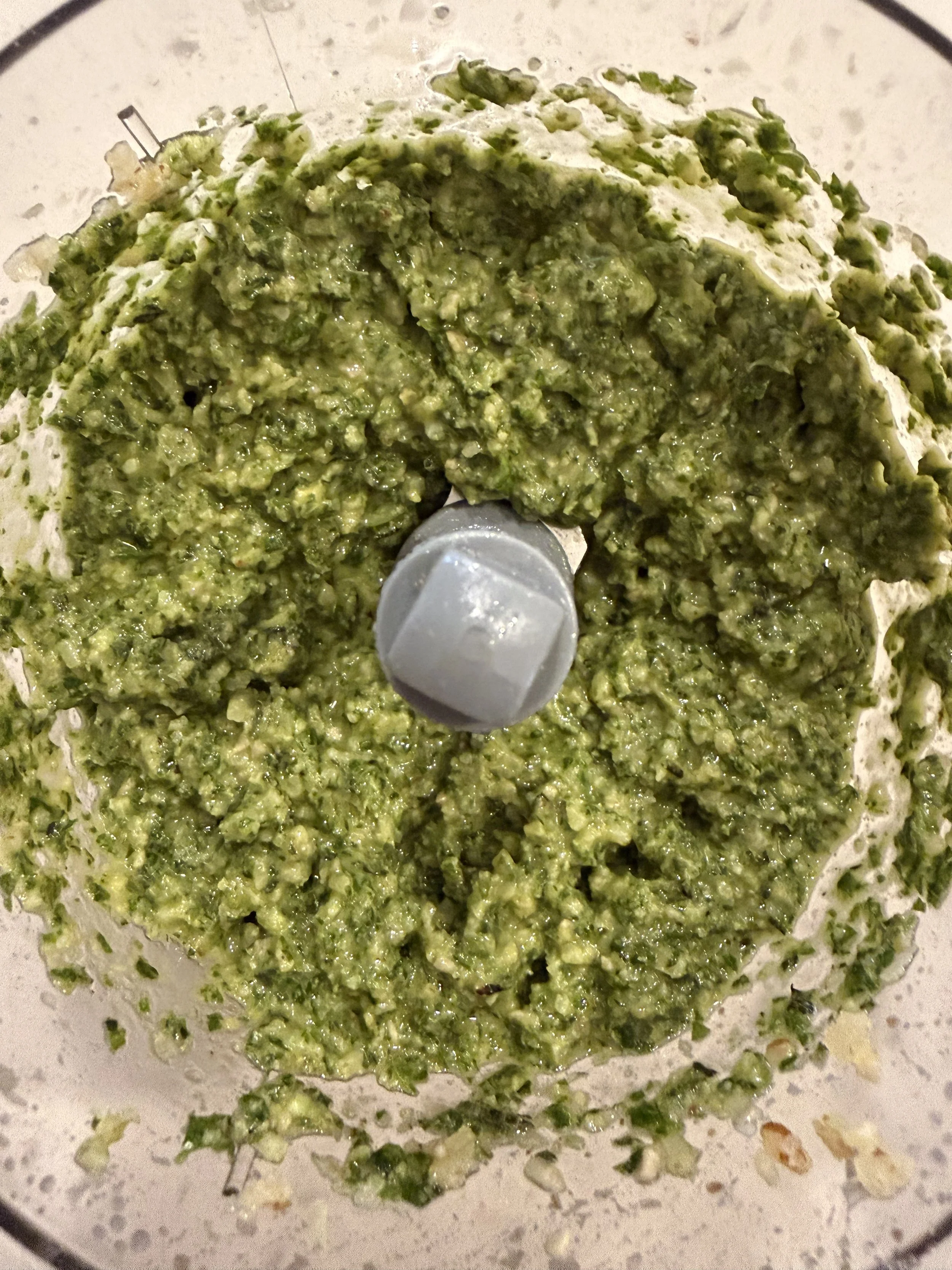 Add basil and pulse again until the leaves begin to break down.